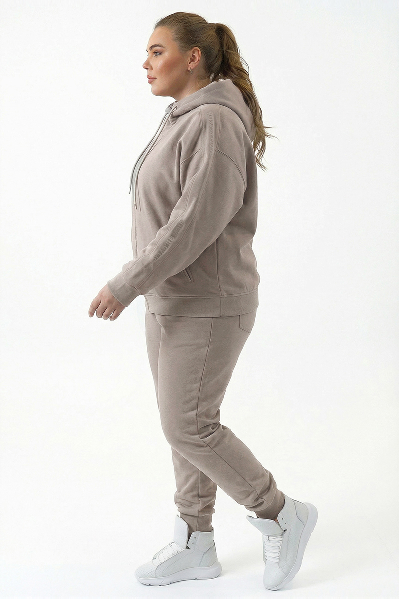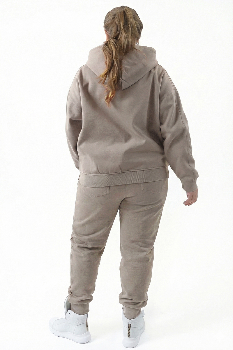 Die Kapuzenjacke ist mit einem Reißverschluss und Außentaschen für die bequeme Aufbewahrung kleiner Gegenstände ausgestattet. Die Hose mit hoher Taille und Gummizug sorgt für einen bequemen Sitz und Bewegungsfreiheit und verfügt über vier Außentaschen. Die beige Farbe macht das Outfit vielseitig und lässt sich leicht mit anderen Kleidungsstücken im Sport- oder Casual-Stil kombinieren.