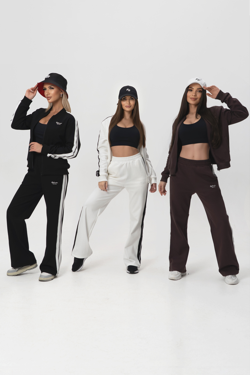 Die Jacke wird mit einem Reißverschluss geschlossen und hat keine Kapuze oder Manschetten, wodurch eine schlanke Silhouette entsteht. Zwei Außentaschen sorgen für zusätzliche Praktikabilität im Alltag. Die Hose mit hoher Taille verfügt ebenfalls über zwei Außentaschen und ist bequem für aktive Bewegungen ohne Einschränkungen.