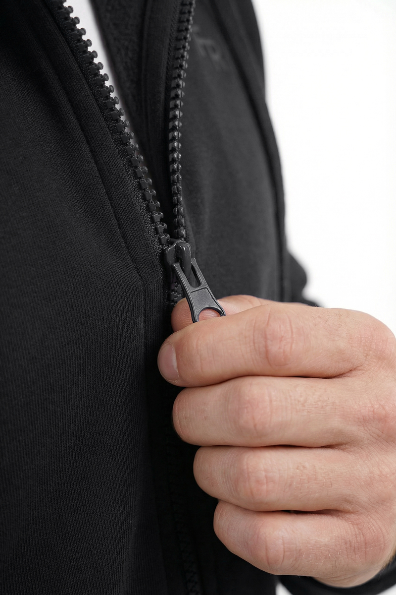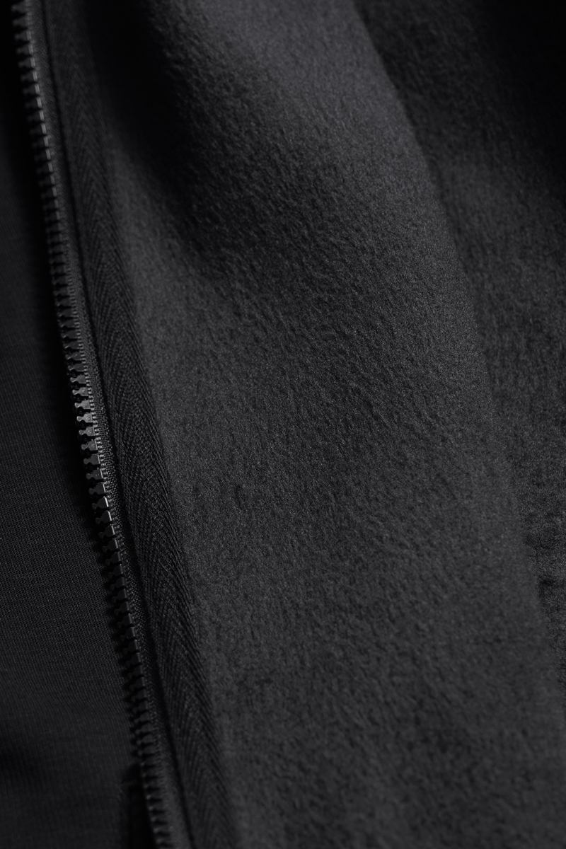 Der Anzug ist aus poliertem, strapazierfähigem, dichtem Strickstoff mit Plüsch gefertigt, der für Wärme, Weichheit und Formstabilität sorgt. Die Jacke ist mit einem Reißverschluss, einer Kapuze mit Kordelzug und Manschetten ausgestattet, die den Windschutz verbessern. Der elastische Schnitt und die mittlere Passform garantieren einen bequemen Sitz ohne Bewegungseinschränkungen.