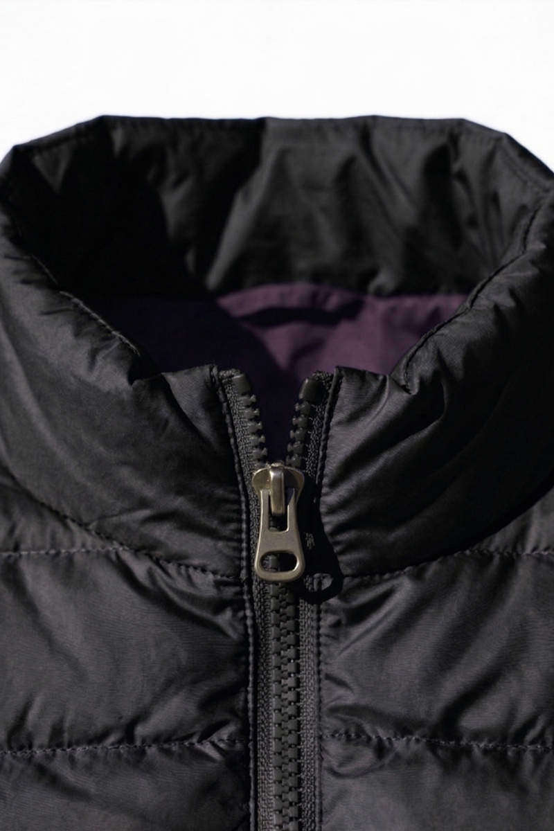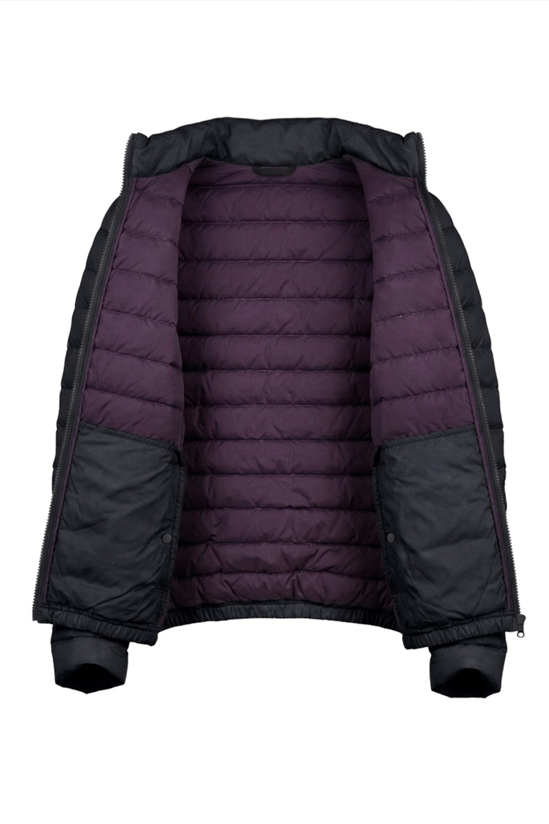 The jacket features a center front zipper with a single slider for ease of use. The absence of a hood emphasizes the model’s minimalist design and expands its versatility for pairing with various clothing styles. It includes four functional pockets—two exterior and two interior—for essential items.