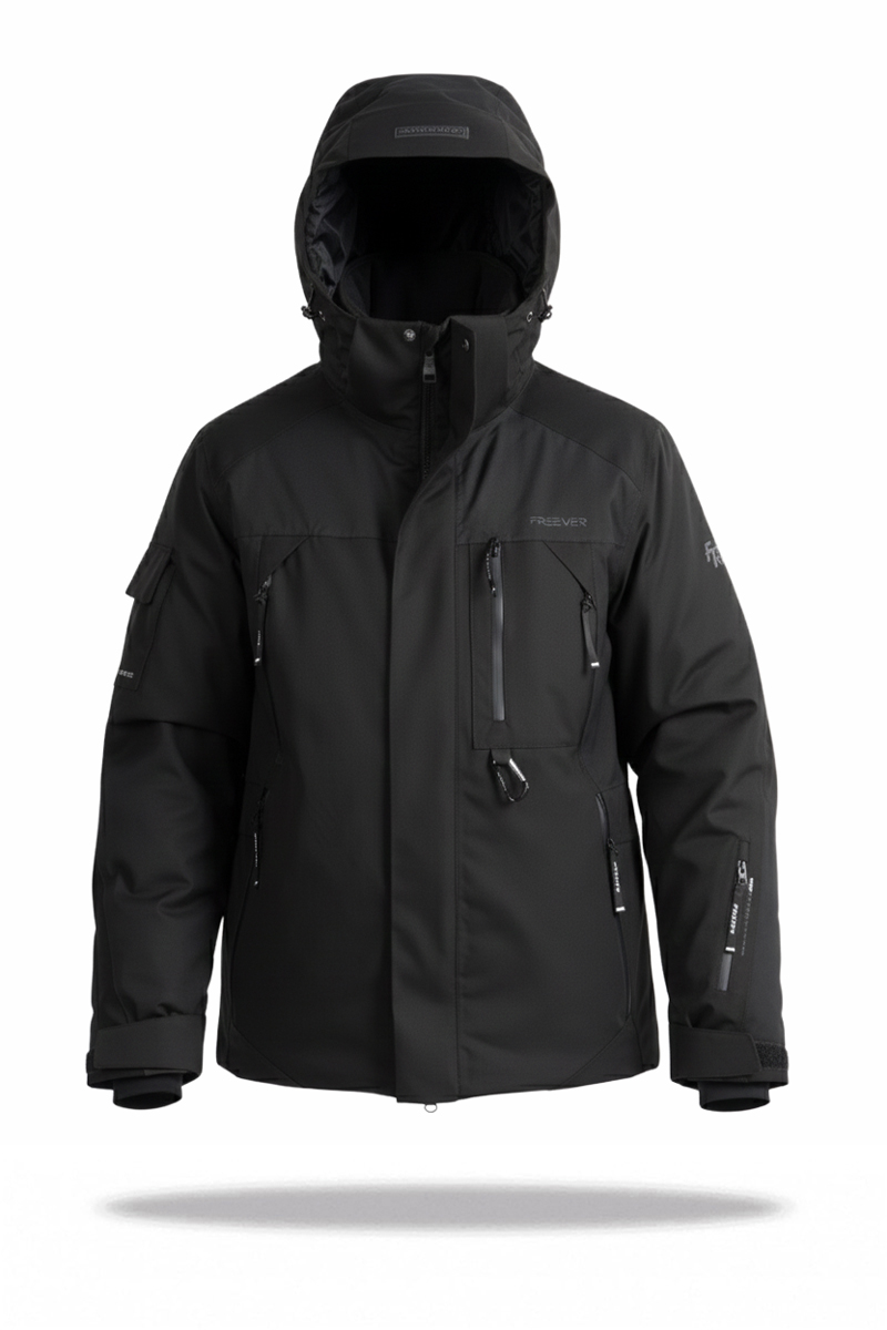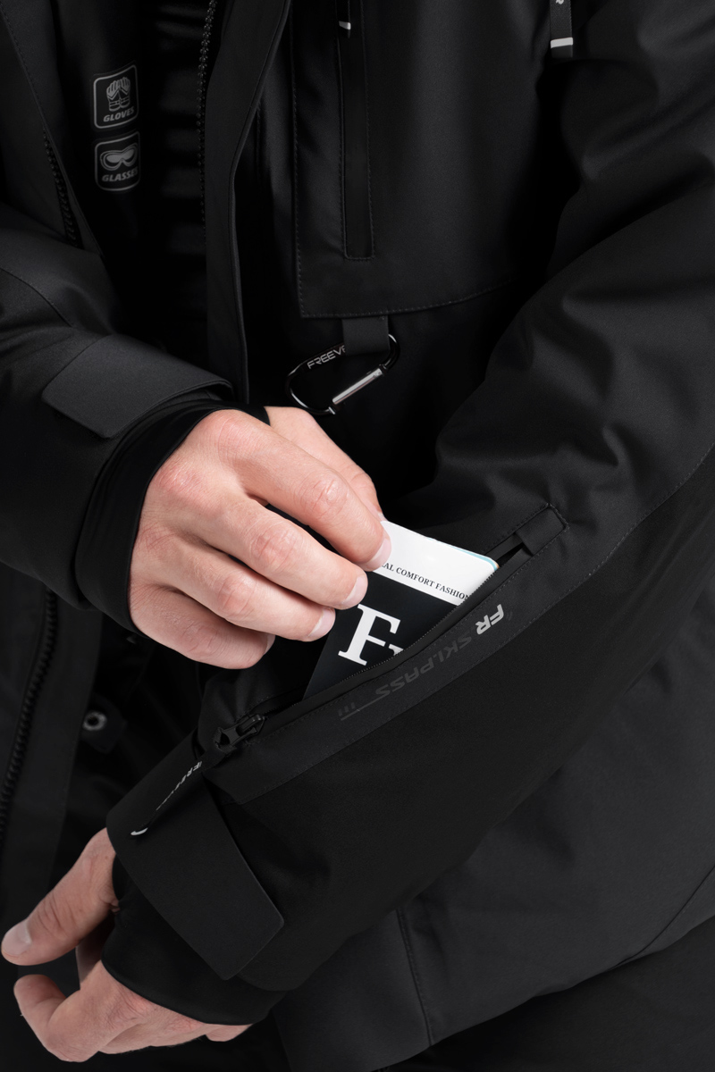 The Freever NF 21640 men's ski jacket in black is designed for active use in winter conditions and intensive skiing. The 4-WAY SYSTEM polyester outer material provides durability, elasticity and a stable fit during movement. The membrane construction with a water resistance of 15,000 mm and a breathability of 15,000 g/m²/24g effectively protects against snow, moisture and wind, maintaining a comfortable microclimate.