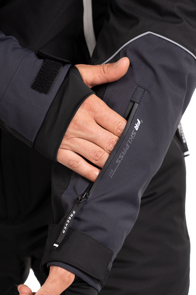 Extra ventilation, waterproof zippers, taped seams, internal cuffs, and an adjustable waistband ensure comfort and a secure fit. The stylish black color and contrasting details make this style practical and visually striking—for professionals and outdoor enthusiasts alike.