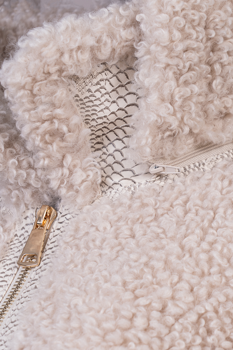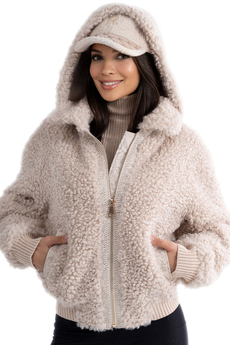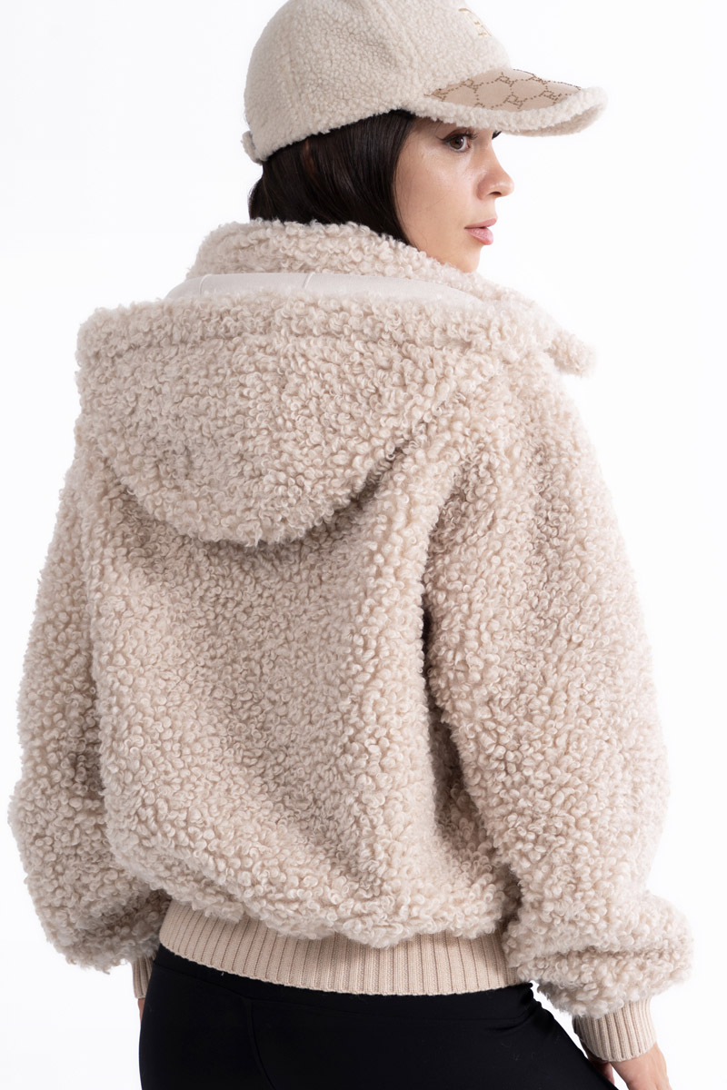 Stylish women's dungaree coat Freever NF 25638 in beige is an ideal choice for cool spring and autumn. Made of synthetic knitted faux fur, it has a soft texture and is pleasant to the touch. The short “under the elastic band” style with a comfortable hood gives the model a modern and youthful look, and two external pockets add practicality.