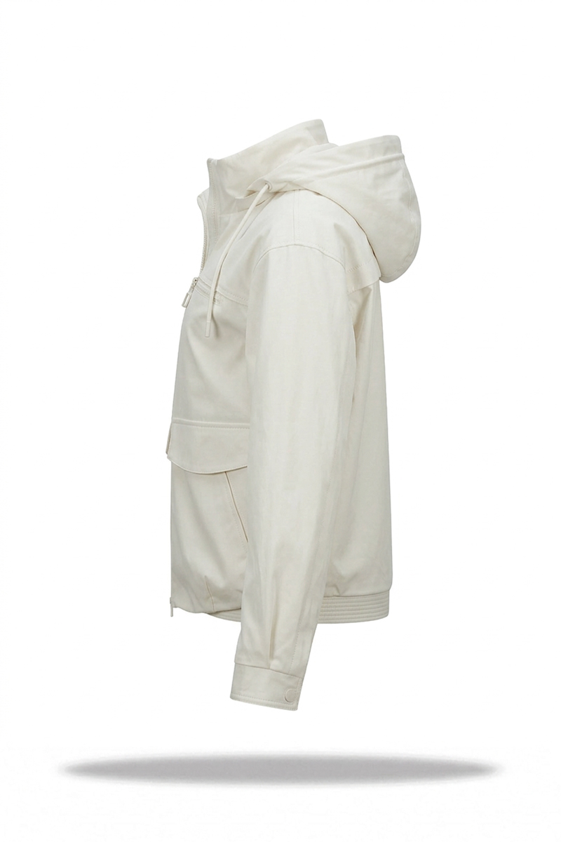 The jacket has a removable hood, which allows you to adapt the model to different weather conditions and styles. The central fastener—a zipper with two sliders—ensures ease of use and freedom of movement. The practicality of the model is complemented by functional pockets: two external pockets for quick access to essential items and one internal pocket for storing small items.