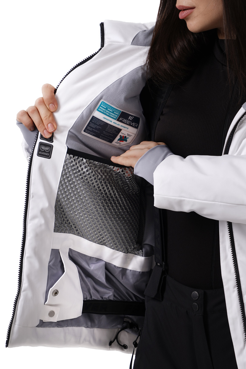 The white color with contrasting accents emphasizes the modern, sporty style, while the detachable hood, drawstrings, ventilation, and internal pockets make this model comfortable and practical. An excellent choice for skiing, hiking, and active winter recreation.