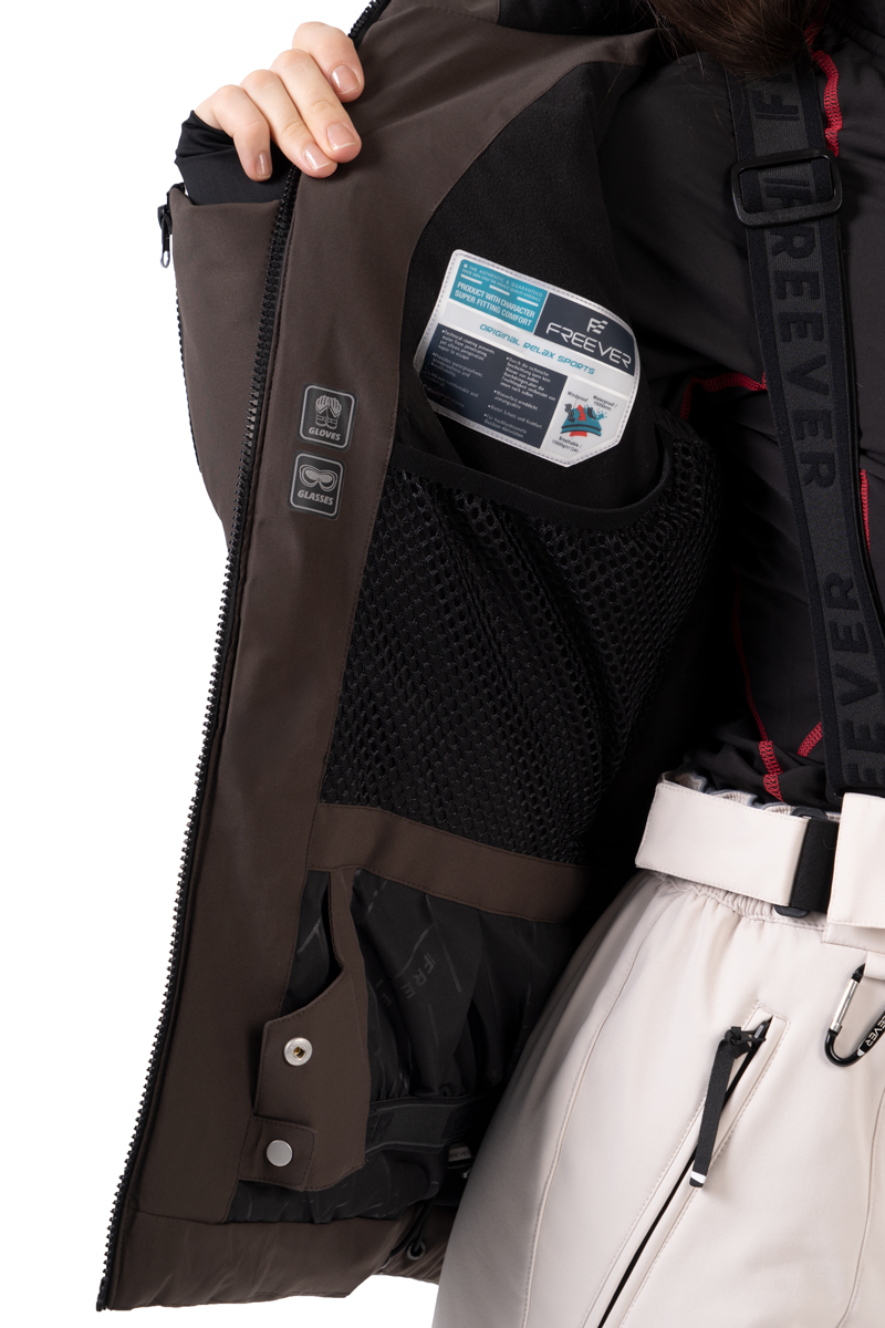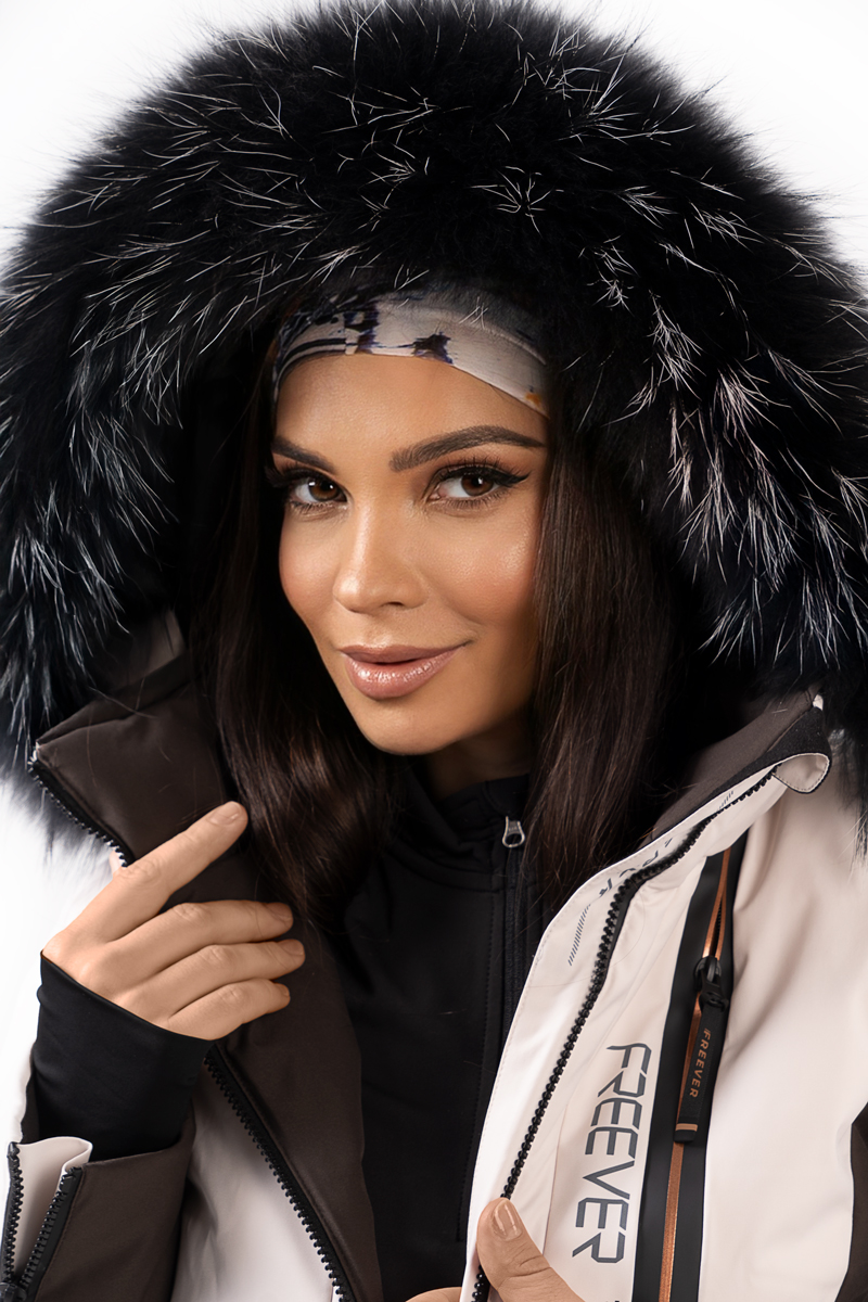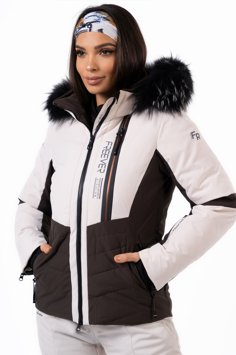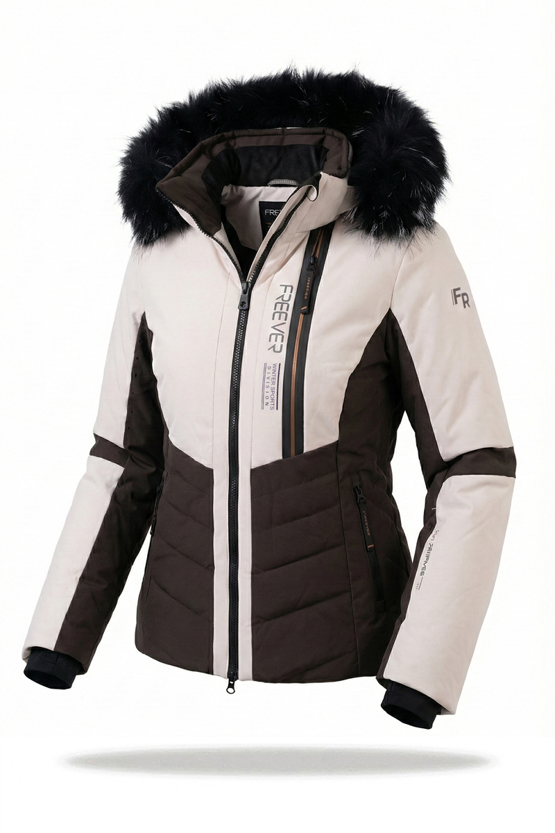 The Freever NF 21630 women's ski jacket in beige is designed for intense skiing and reliable protection in changing weather conditions. The durable 4-WAY SYSTEM material made of 100% polyester combines elasticity and wear resistance, while the membrane provides 15,000 mm waterproofing and high breathability — 15,000 g/m²/24 hours. The interior features antistatic microfleece and 120 g/m² polyzifir fiber insulation, ensuring comfort and stable warmth during activity.