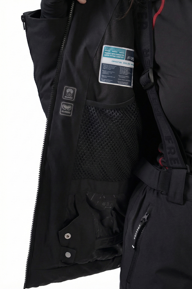 The model is equipped with drawstrings with fasteners on the hood and along the bottom of the jacket, as well as a well-thought-out pocket system: two internal and three external compartments provide convenient storage for all your essentials. Freever NF 21630 is a technical black ski jacket designed for consistent comfort and protection in the mountains.