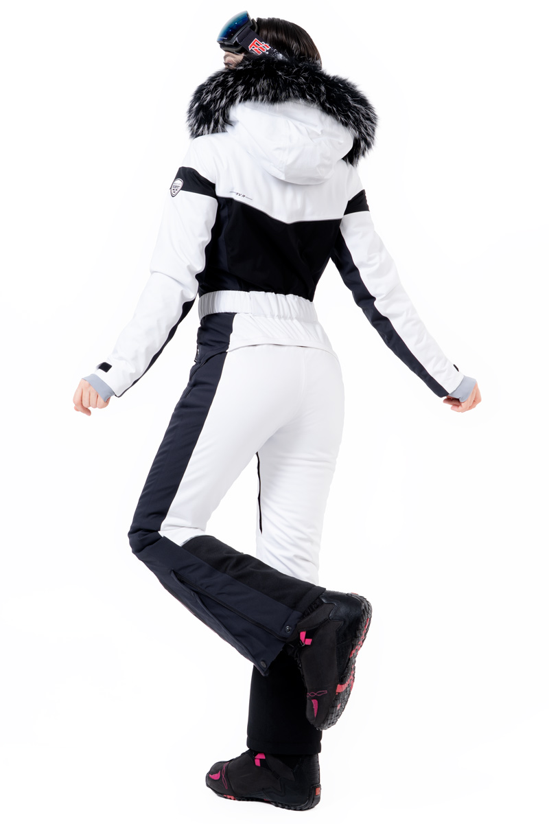 A detachable fur-lined hood, snow skirt, adjustable waistband, drawstrings, and taped seams ensure reliable protection from the cold and snow. The black and white color scheme creates a sophisticated and distinctive look—the perfect choice for stylish winter sports enthusiasts.