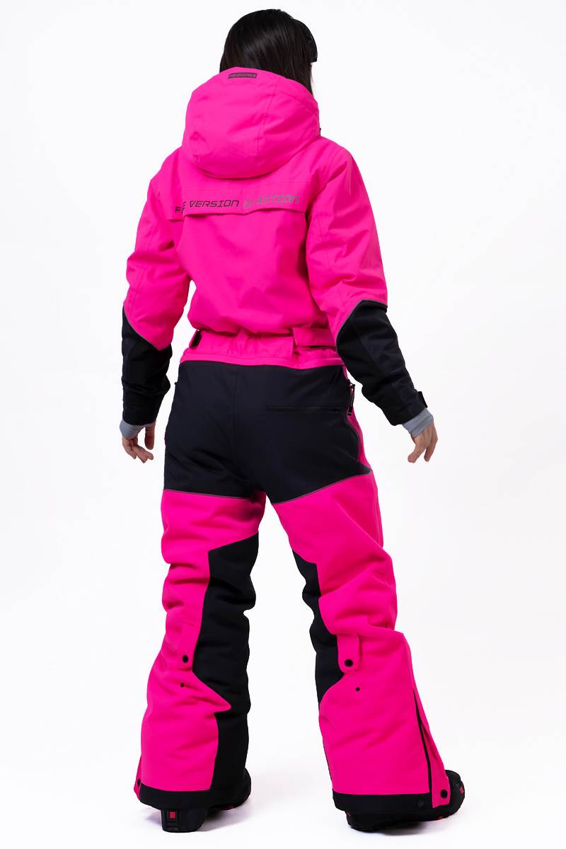 The jumpsuit features waterproof zippers, taped seams, vents, and internal cuffs, providing reliable protection from wind and moisture. The bright pink color and contrasting black inserts add a dynamic touch and make it stand out against the snowy slopes.