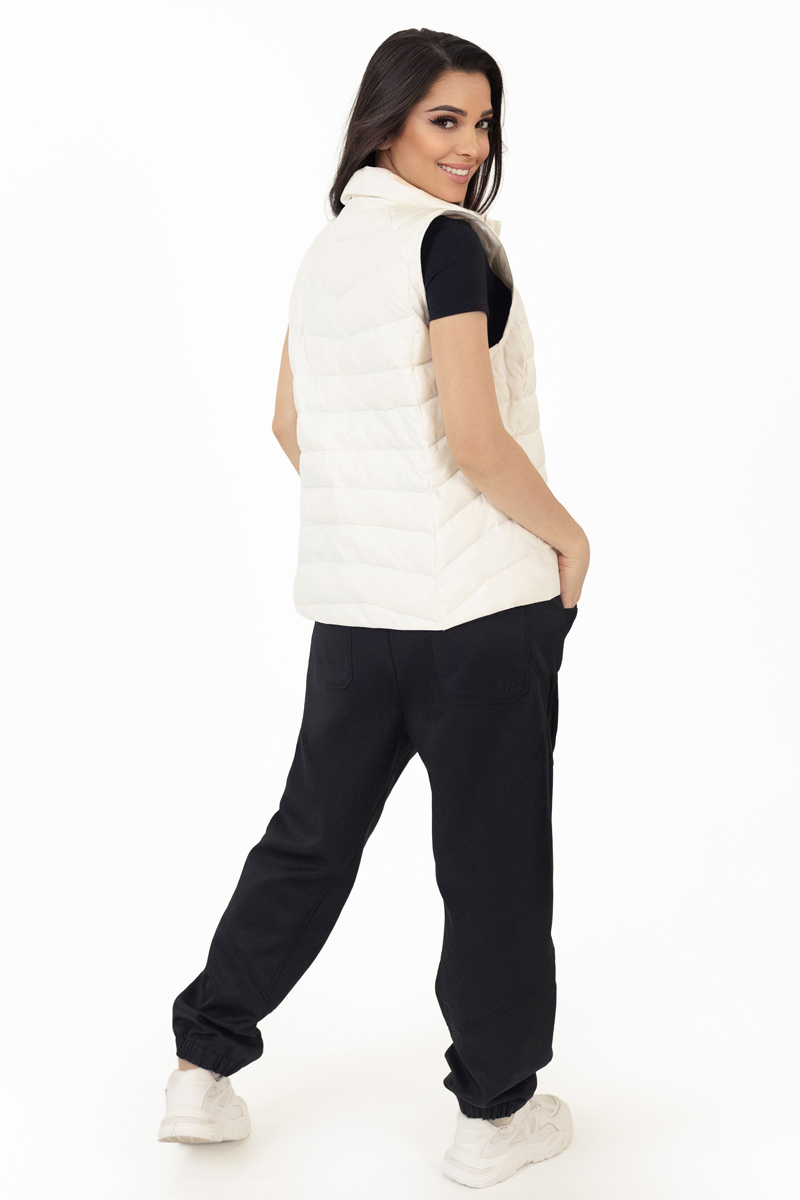 The white color lends a fresh and elegant feel, while the simple design with vertical quilting, internal and external pockets, and a secure zipper makes this vest a practical and fashionable everyday staple. An ideal choice for women who value comfort and refinement in the details.